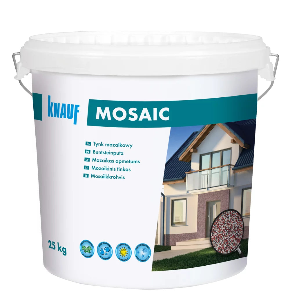 Tynk mozaikowy to specjalnie dobrana żywica silikonowo-akrylowa w połączeniu z wysokiej jakości kolorowym kruszywem. Knauf Mosaic jest wysoce odporny na wodę i mróz. Idealnie nadający się na wykończenia cokołów, klatek schodowych, ciągów komunikacyjnych itp. Do stosowania we wnętrzach, w miejscach szczególnie narażonych na uszkodzenia i zabrudzenia - na klatki schodowe, korytarze, do nieogrzewanych garaży